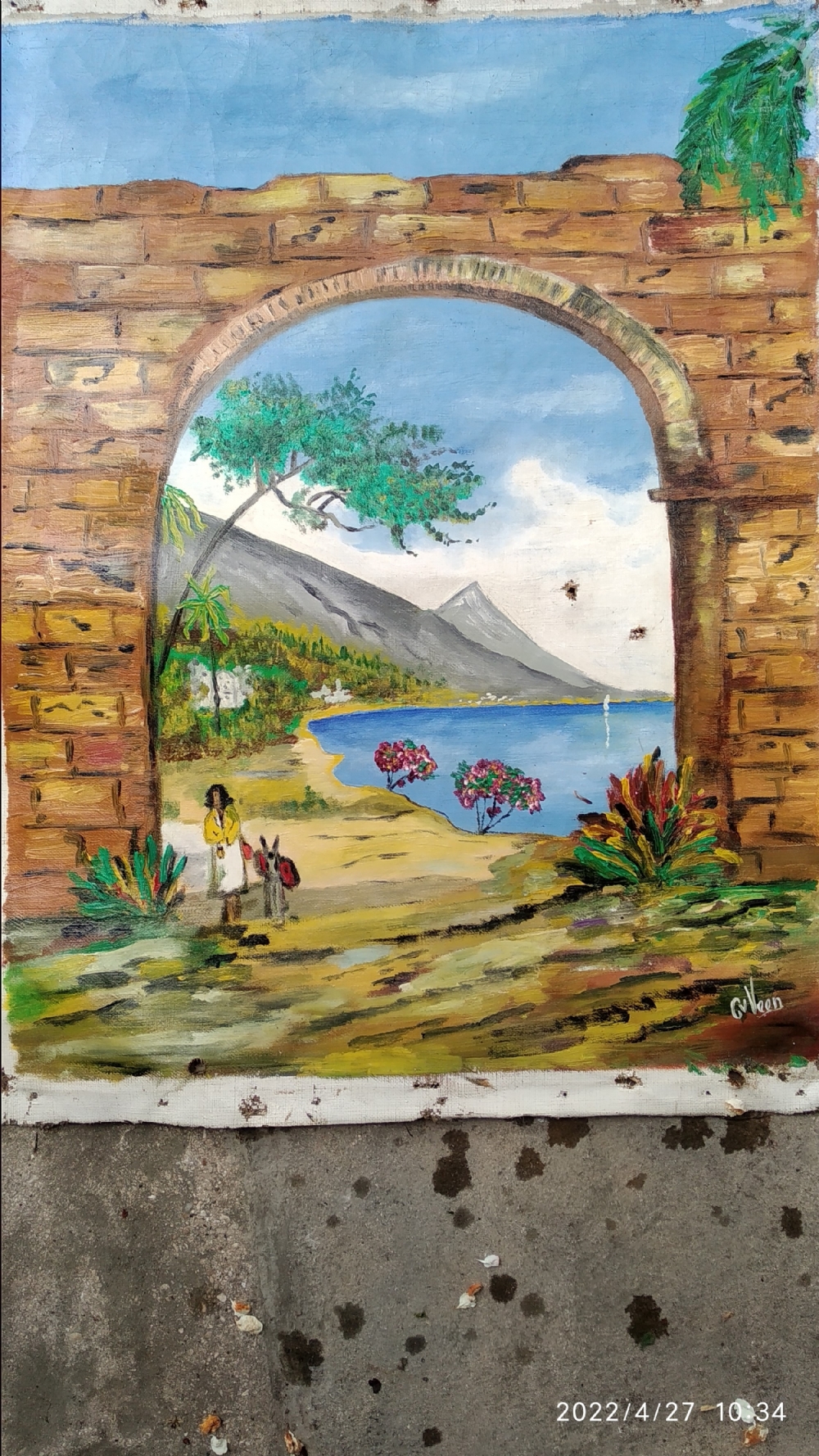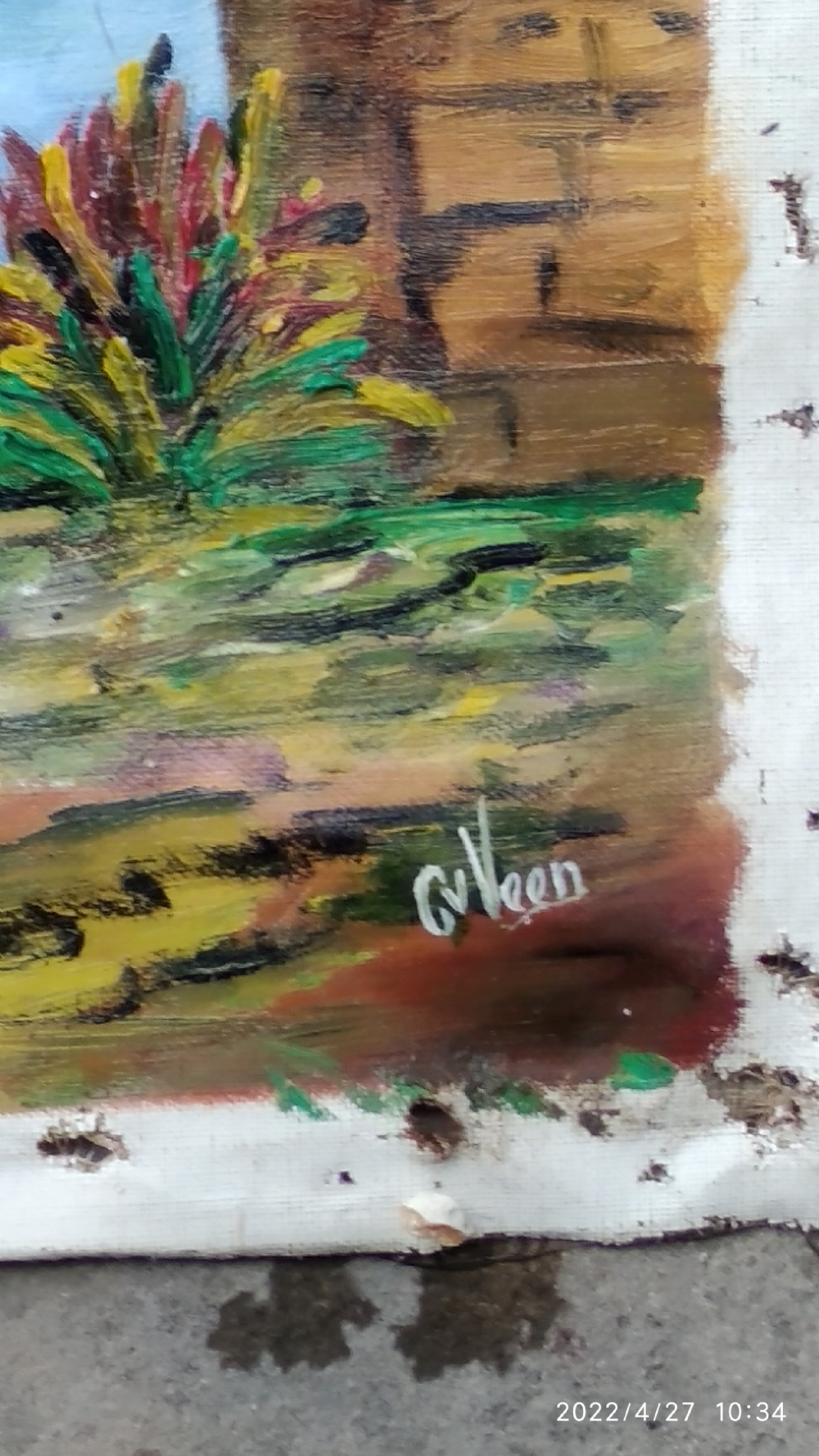 Bij het recent opruimen van de restanten van,wat voor de laatste stormen, een schuurtje is geweest, kwam het restant van een schilderswerkje tevoorschijn. Het op linnen geschilderde tafereel was aan de binnenkant van de schuur vastgeniet. (1 [📷] )Het schilderij is gesigneerd.